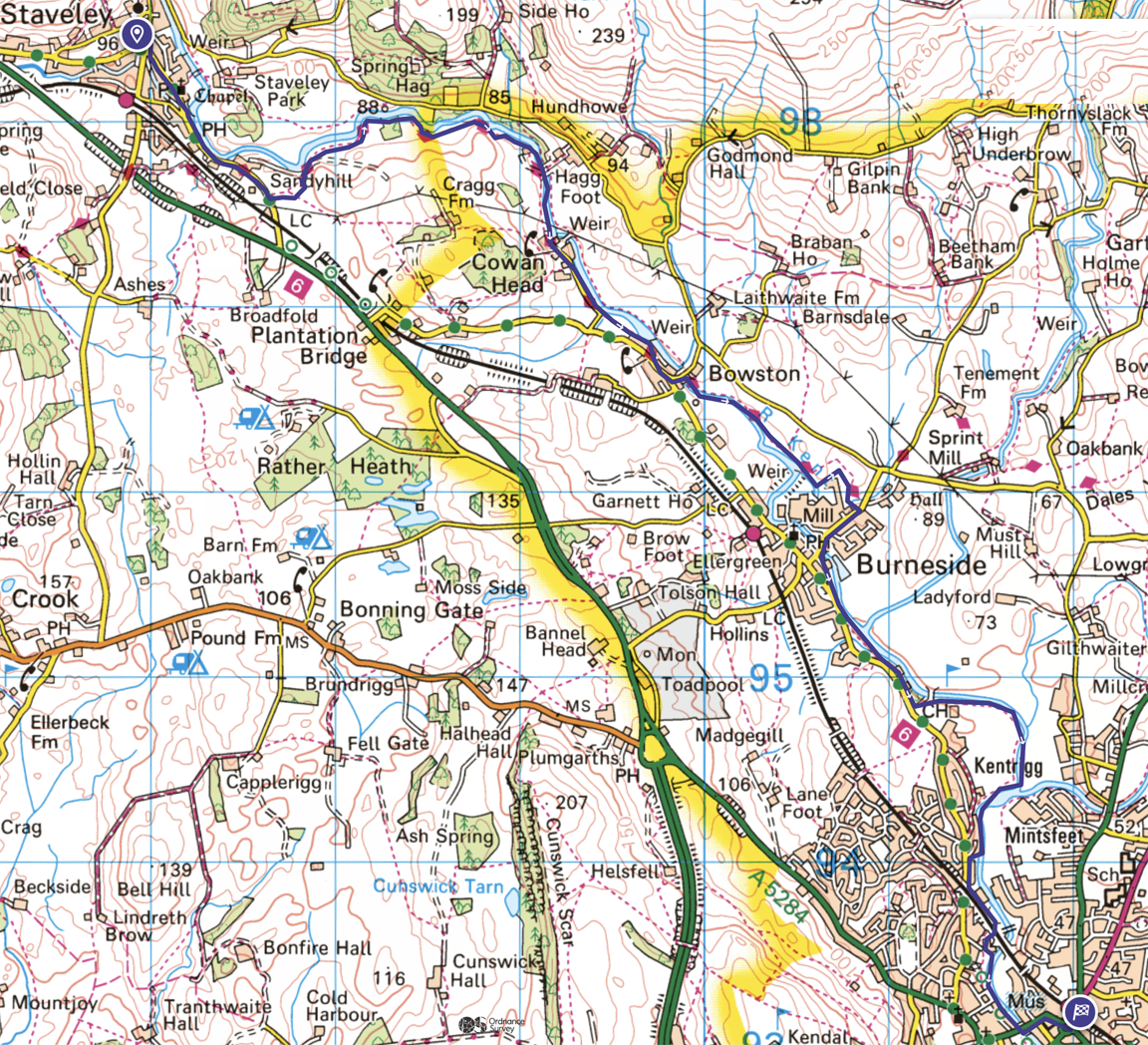 A leisurely ramble from Staveley to Kendal following for the most part, the River Kent. Return by bus or train from Kendal. 6.5 miles with around 135ft of ascent that should take you under 4 hours.